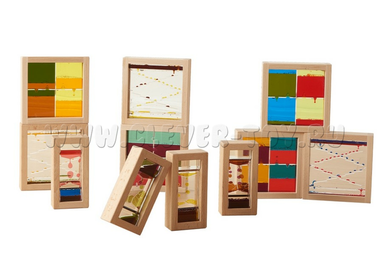 Игровой набор представлен в виде 10 деревянных блоков (6 квадратной формы и 4 прямоугольной формы) с акриловыми стеклами (прозрачными и цветными), заполненными разноцветной жидкостью внутри.