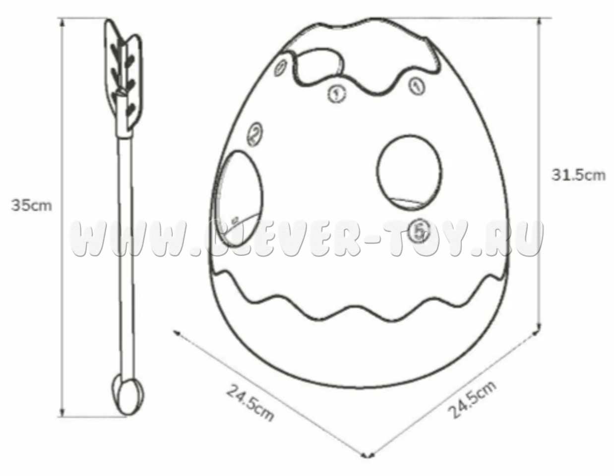 Цель игры: набрать большее количество очков, метая стрелы в лунки яйца. Каждой лунке присваивается балл в зависимости от уровня сложности. Стикеры с цифрами входят в комплект.