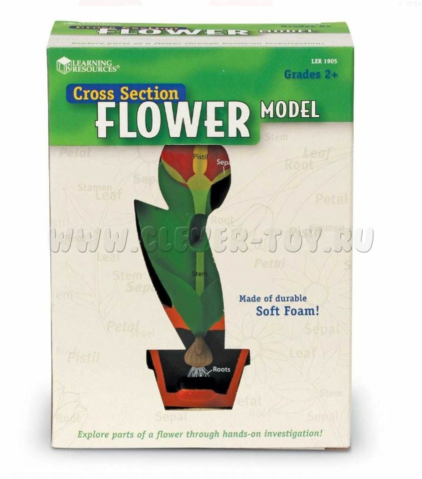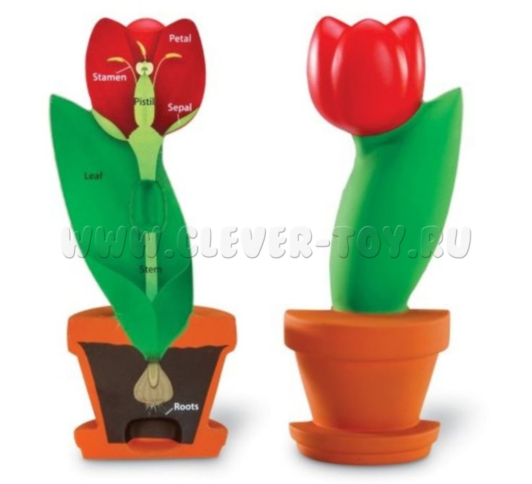 Реалистично подробная пластиковая модель цветка разделяется на половинки: на одной - названия частей цветка (на английском языке), на другой - только буквенное обозначение, для самостоятельной проверки.