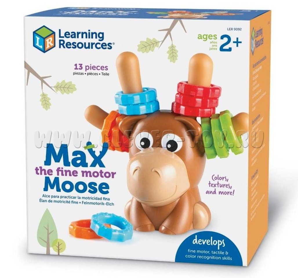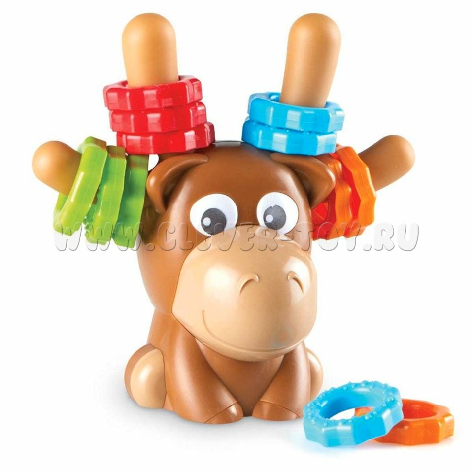Лосенок Макс будет очень рад, если его новый друг поможет ему рассортировать по цвету все колечки-шайбы на рожках. В ответ Макс поможет другу усовершенствовать мелкую моторику, развить координацию движений, научит рассчитывать силу рук.