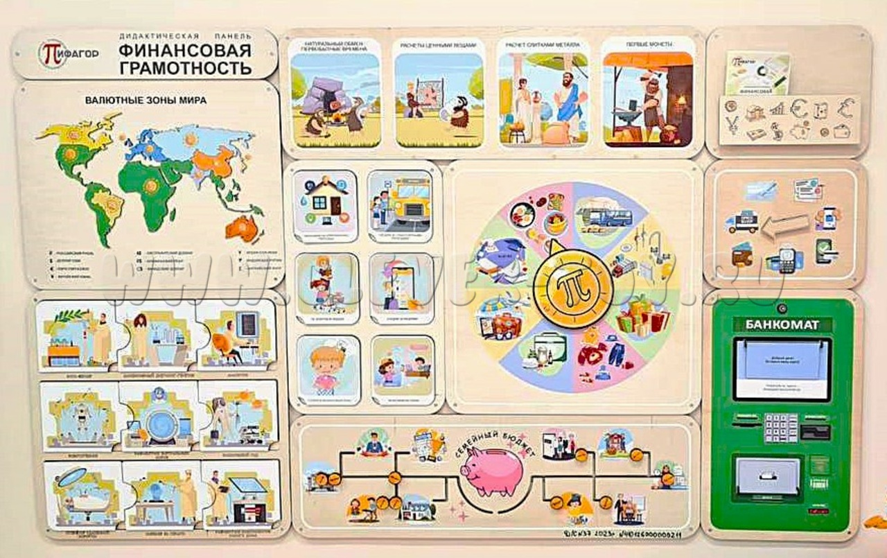 Дидактическая панель "Финансовая грамотность" знакомит детей дошкольного возраста с основами экономики: откуда берутся деньги, зачем их беречь, как планировать покупки и разумно тратить. Панель помогает сформировать первичные представления о финансовой грамотности в доступной игровой форме.