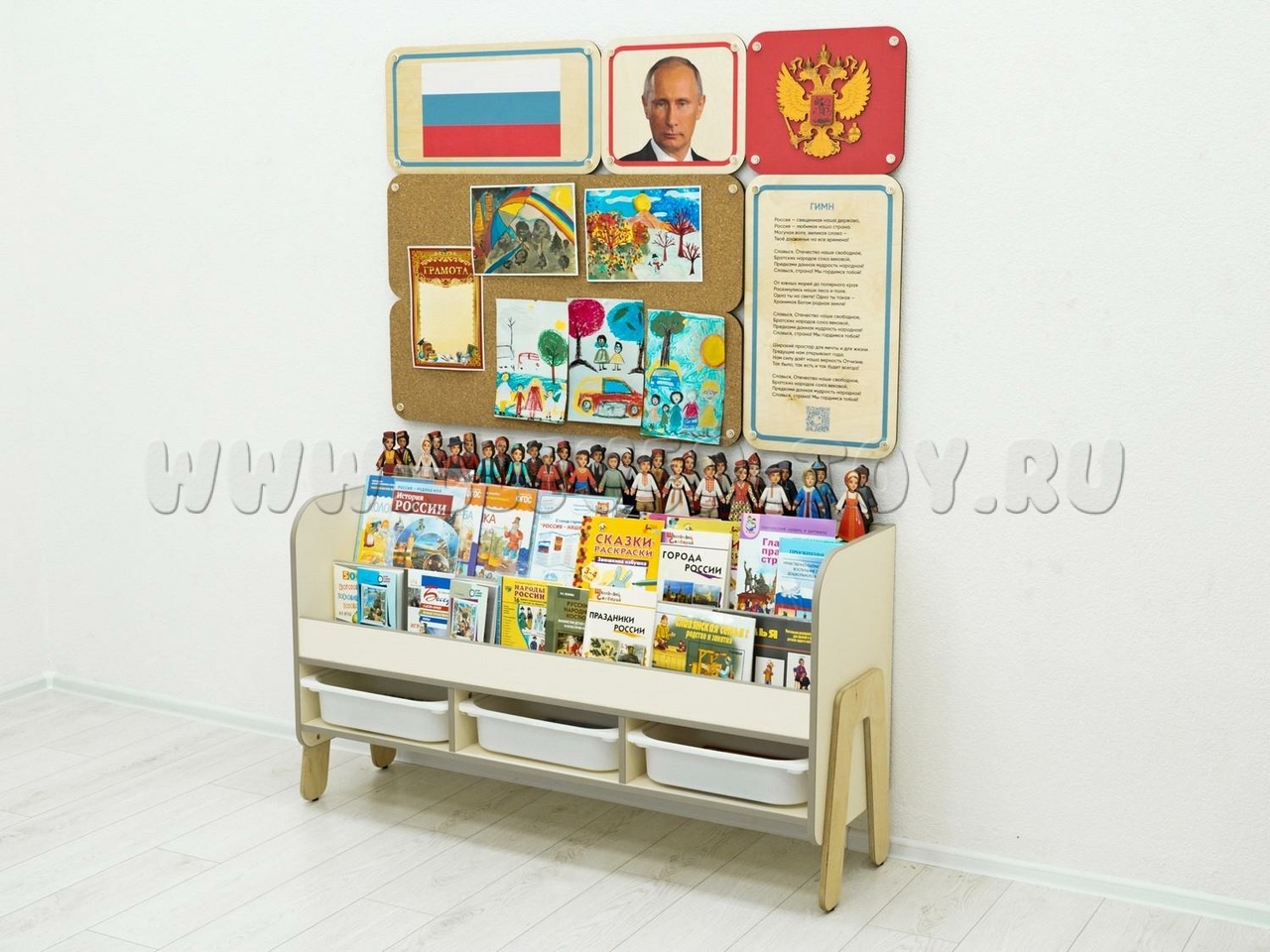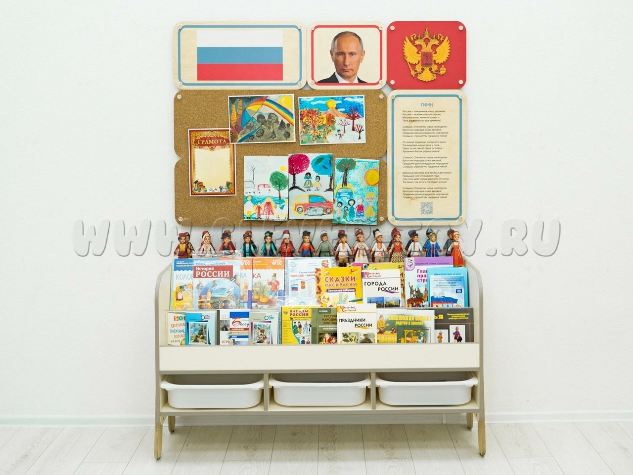 Уголок по патриотическому воспитанию для группы детского сада. Содержит основную символику РФ, панели для размещения работ воспитанников, книги по истории России, ВОВ, русские народные сказки и песни, книги на тему семьи и семейных ценностей, раскраски с тематическими иллюстрациями, настольные игры на тему патриотического воспитания. Соответствует требованиям ФГОС 3.